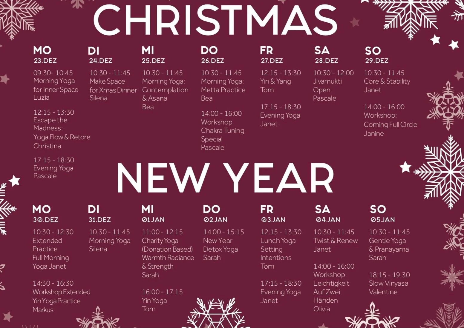 Over the Christmas and New Year period, we are offering a schedule, packed with specials, workshops and regular classes: